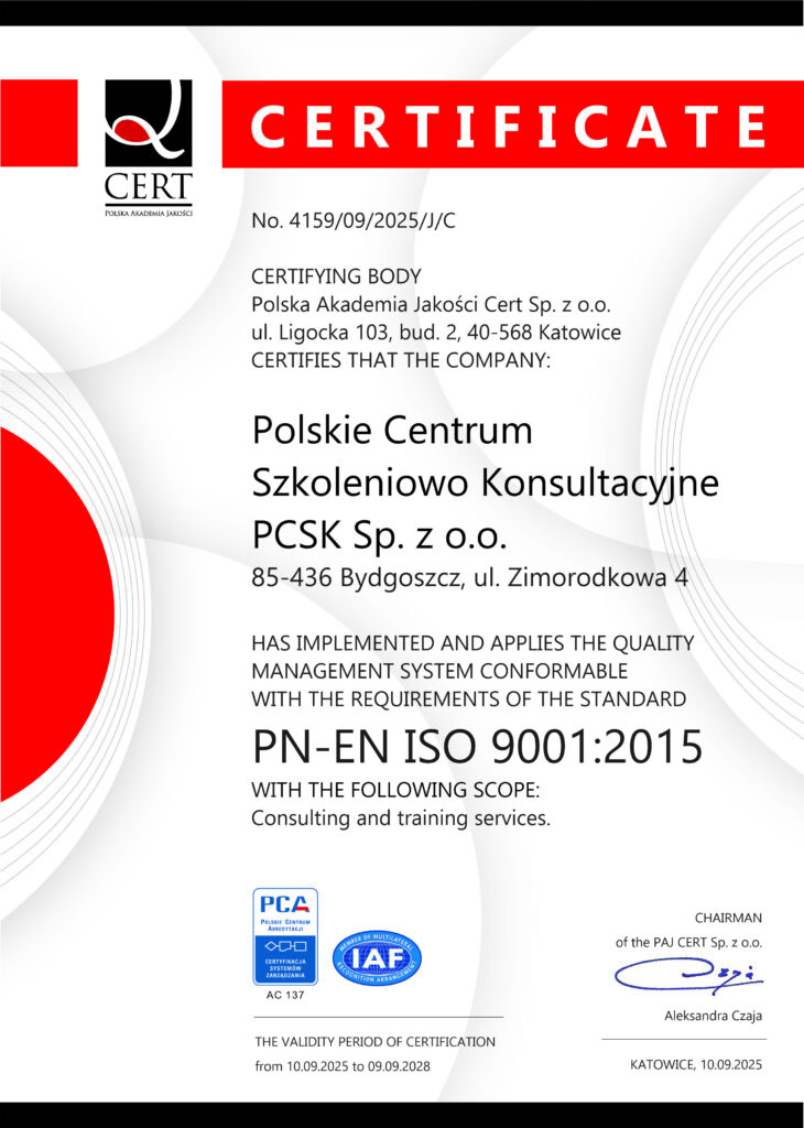 Z dumą informujemy, że Polskie Centrum Szkoleniowo Konsultacyjne PCSK Sp. z o.o. uzyskało prestiżowy certyfikat ISO 9001:2015. To dla nas ogromne wyróżnienie i potwierdzenie, że nasza praca spełnia najwyższe, międzynarodowe standardy jakości.