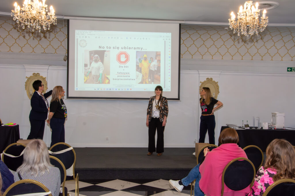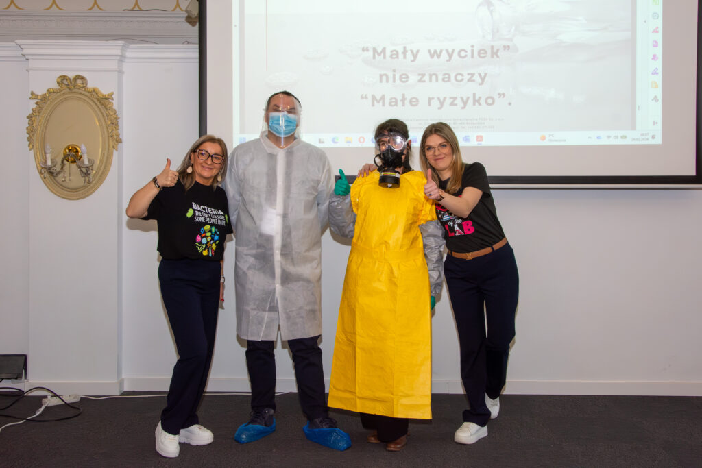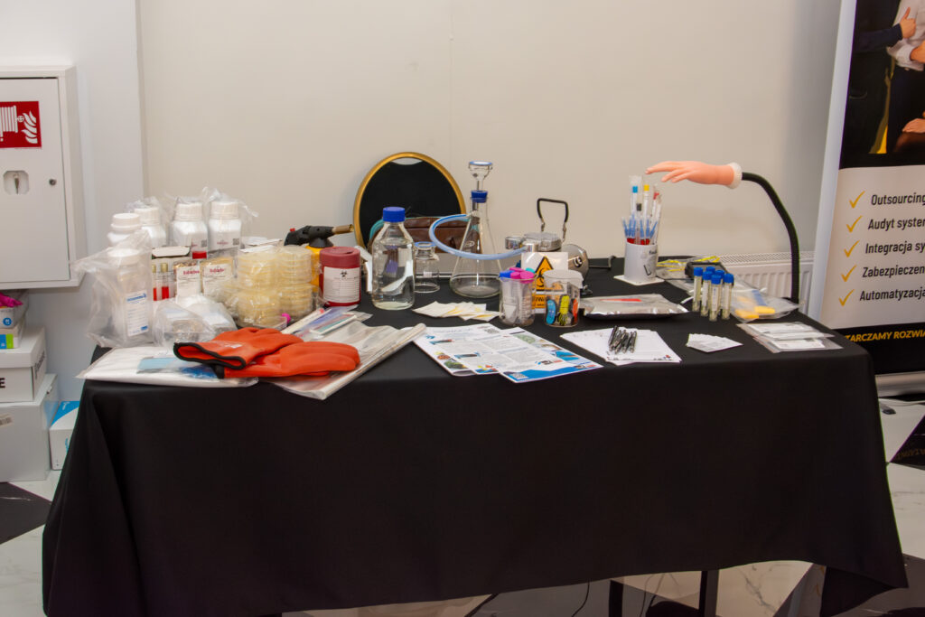 Strefa BHP przyciągała uwagę praktycznym podejściem – odzież laboratoryjną prezentowali nasi „Uczestnicy” Jasiu i Małgosia, a Marcin omawiał szafy bezpieczeństwa, maty sorpcyjne, maski oraz rozwiązania do reagowania na wycieki.