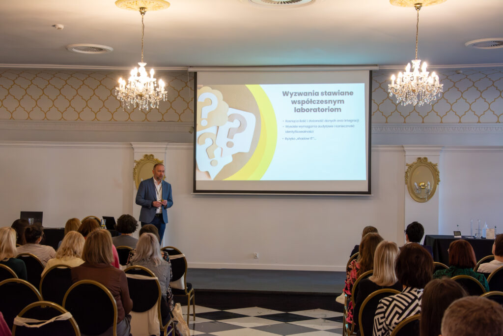 O cyfrowym bezpieczeństwie mówił przedstawiciel Hakon Software. Bartosz pokazał, jak cyberzagrożenia realnie wpływają na funkcjonowanie laboratoriów i dlaczego systemy informatyczne wymagają takiej samej uwagi jak wyposażenie techniczne.